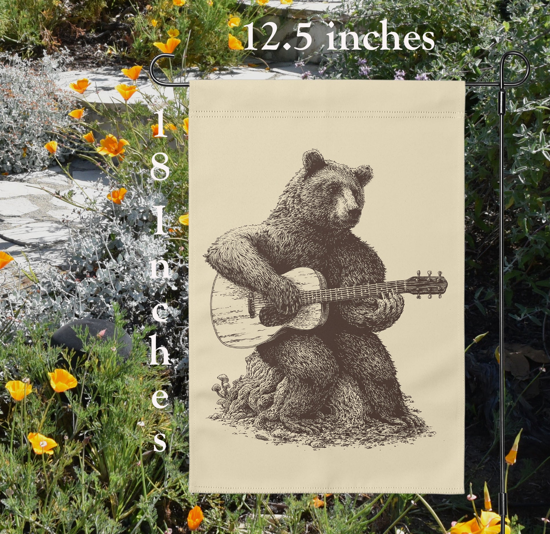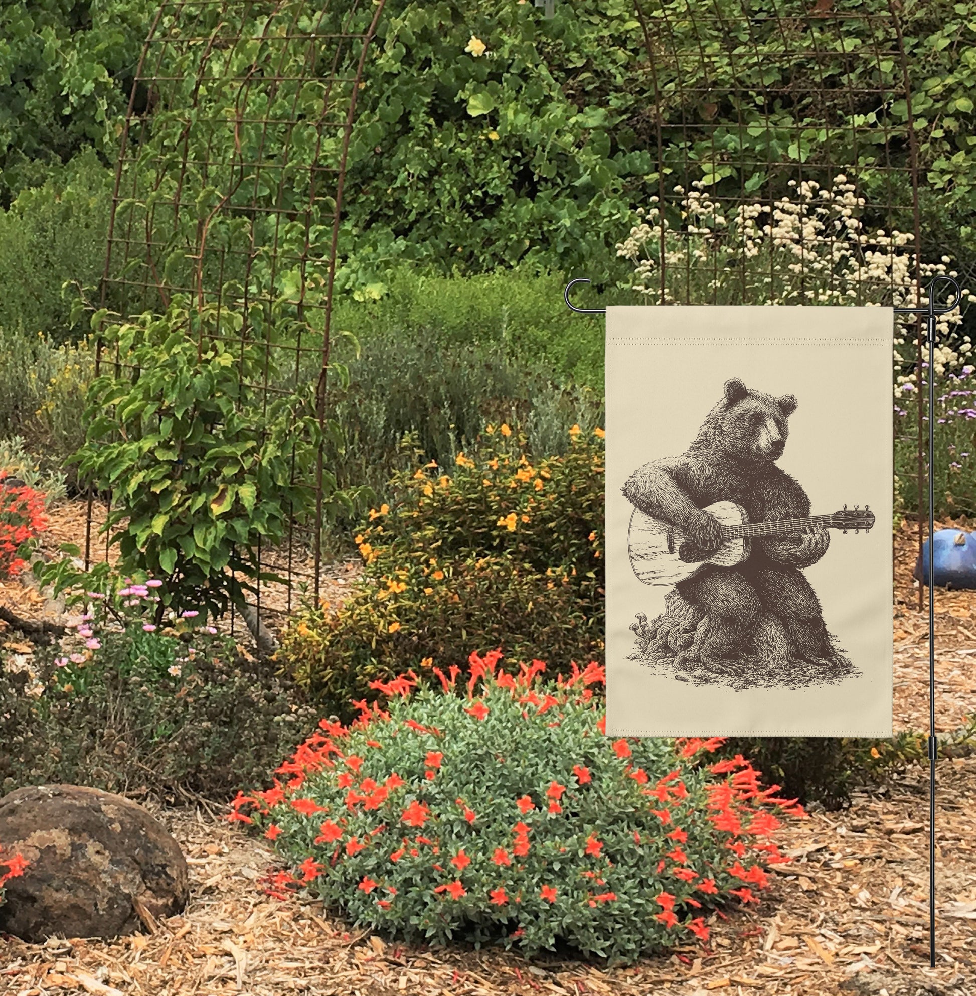 This adorable bear playing guitar garden flag is printed on a 12.5" x 18" polyester hemmed banner. It is a double sides print. No stand included. Perfect for any gardener or anmial lover. This friendly flag will go perfect in any front yard, back yard, flower garden, or vegetable garden.