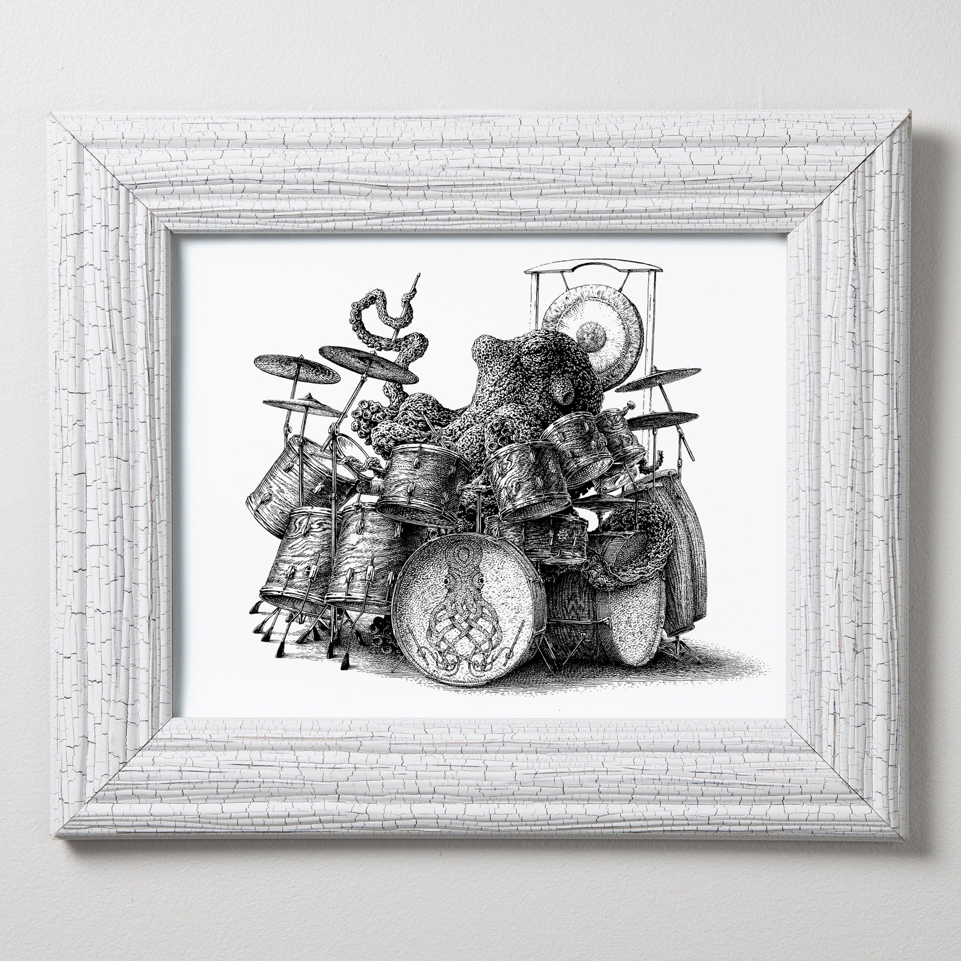 This detailed ink drawing of an octopus playing drums was drawn in 2018 and soon became a big hit. It's available here as a high resolution print in multiple sizes (in inches):
