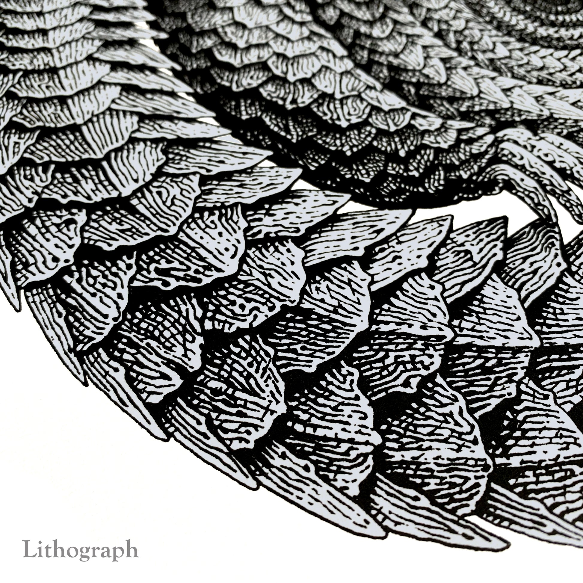 This meticulously executed ink drawing shows a whirl of scales twisting off into infinity. Each print edition has been carefully reproduced to show the intense detail of the original drawing. The 11x14 and 16x20 prints are black on white, 192 gsm archival paper.